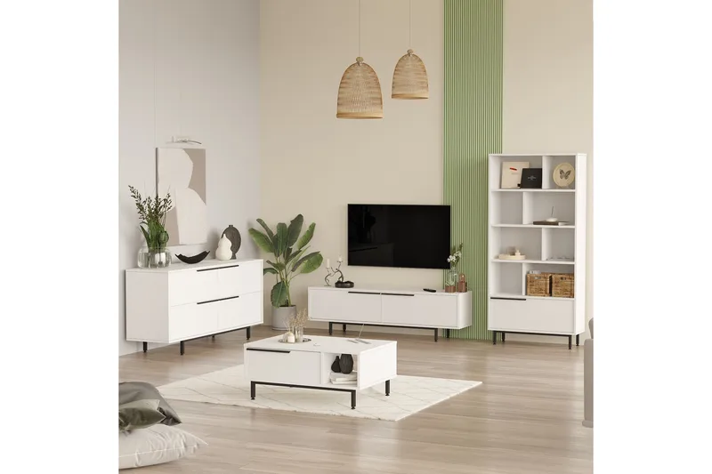 - Sisältyy toimitukseen: 1x sohvapöytä, 1x TV-taso, 1x lipasto, 1x vitriinikaappi