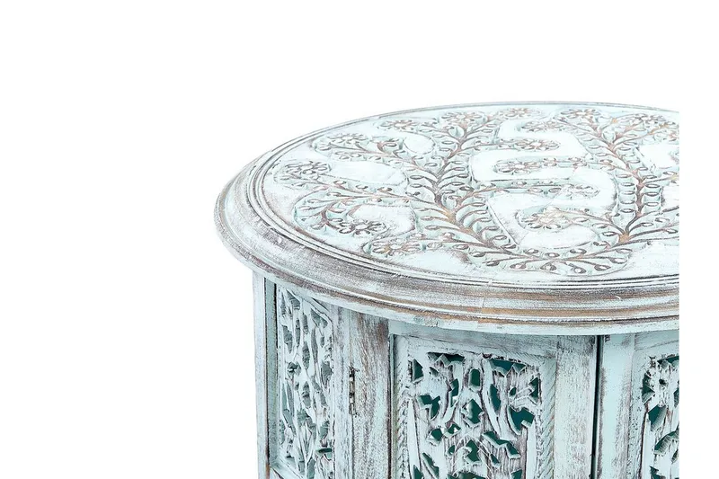 Rustiikkinen puinen sivupöytä. Tämä rustiikkinen sivupöytä erottuu edukseen olohuoneen sisustuksessa. Sen runko ja pöytälevy on koristeltu kauniisti kaiverretuilla kukkakuvioilla, jotka antavat pöydälle ainutlaatuisen, katseita keräävän ilmeen. Pöytä on valmistettu käsin kestävästä mangopuusta, jonka ansiosta se ei tarvitse päivittäistä ylläpitoa. Vaaleansinisen maalin haalistunut viimeistely antaa sivupöydälle ikääntyneen vintage-ilmeen.