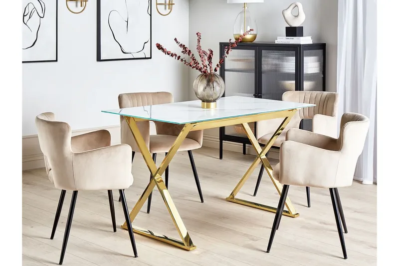 Ylellinen suorakulmainen pöytä karkaistu lasitasolla. Kohota ruokailutilasi ilmettä tällä glamour-tyylisellä ruokapöydällä. Sen kiiltävät, kullanväriset jalat on valmistettu kestävästä ja vankasta ruostumattomasta teräksestä, joka korostaa marmorikuvioitua karkaistu lasitasoa kauniisti. Materiaaliensa ansiosta pöytä ei vaadi päivittäistä ylläpitoa kestääkseen vuosien käytön, ja tahrojen ilmetessä se on erittäin helppo puhdistaa. Leveä pöytälevy tarjoaa tilaa jopa neljälle hengelle sekä erilaisille ruuille ja juomille.