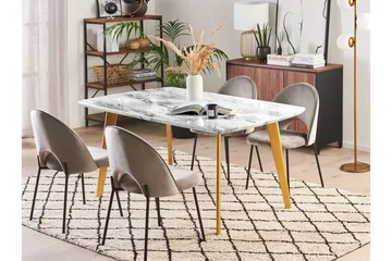 Elegantti pöytä kuudelle. Kohota ruokailutilasi ilmettä tällä suorakulmaisella, katseita keräävällä ruokapöydällä. Helppohoitoisesta MDF-levystä valmistettu pöytälevy kestää vuosien käytön ilman päivittäistä ylläpitoa. Sen kaunis marmorikuviointi on helppo yhdistää erilaisten nykyaikaisten koristeiden kanssa, tehden pöydästä tilan keskipisteen. Kullanväriset rautajalat takaavat vakauden. Pöytälevyn alle kätkeytyvän jatkopalan avulla pöytää on helppo pidentää, jolloin se tarjoaa tilaa jopa kuudelle hengelle.