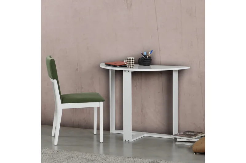 Pöydän valkoinen väri luo raikkaan ja valoisan ilmeen tilaan. Se on valmistettu kestävästä melamiinista ja lastulevystä, mikä tekee siitä kestävän ja helppohoitoisen. Pöydän korkeus on 77 cm, leveys 106 cm ja syvyys 45 cm, mikä tekee siitä sopivan kokoisen ruokailutiloihin.