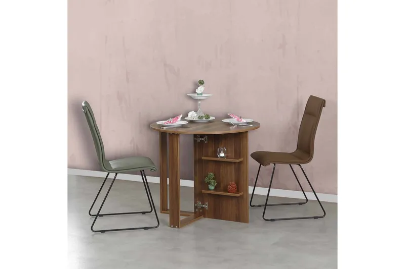 Pöydän ruskea väri ja pähkinä-ulkonäkö antavat sille klassisen ja lämpimän ilmeen, joka sopii mihin tahansa sisustukseen. Sen kokoontaitettava toiminto tekee siitä erityisen kätevän pienemmissä tiloissa, sillä voit taittaa sen kokoon tarpeen mukaan.