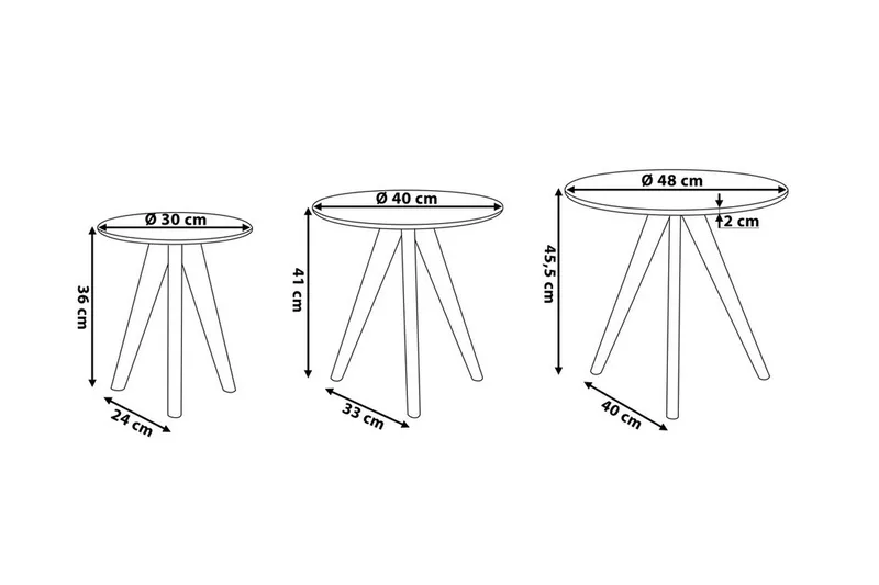 Moderni pyöreä 3-osainen sohvapöytäsetti. Moderni kolmen sohvapöydän setti on täydellinen korostuskappale mihin tahansa nykyaikaiseen olohuoneeseen. Kolmijalkaiset rungot korostavat valkoisia pöytälevyjä kauniisti. Kestävästä MDF-levystä valmistetut valkoiset pöytälevyt ja vaaleat pyökkijalat takaavat pitkäikäisyyden. Sohvapöytäsetti tarjoaa paljon tilaa erilaisille koristeille, lehdille sekä tarpeellisille esineille. Keveytensä ansiosta voit siirrellä settiä ja asetella pöydät miten haluat. Aseta pöydät sohvan tai nojatuolin läheisyyteen luodaksesi tyylikkään kokonaisuuden.