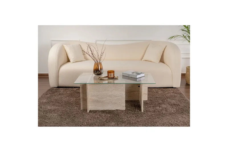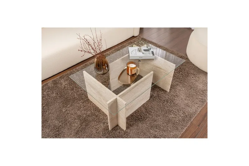 Nosta oleskelutilasi uudelle tasolle upealla travertiinimarmorisella sohvapöydällämme. Valmistettu 100 % karkaistusta lasista ja melamiinipäällysteisestä lastulevyrungosta, tämä sohvapöytä huokuu eleganssia ja hienostuneisuutta.