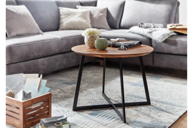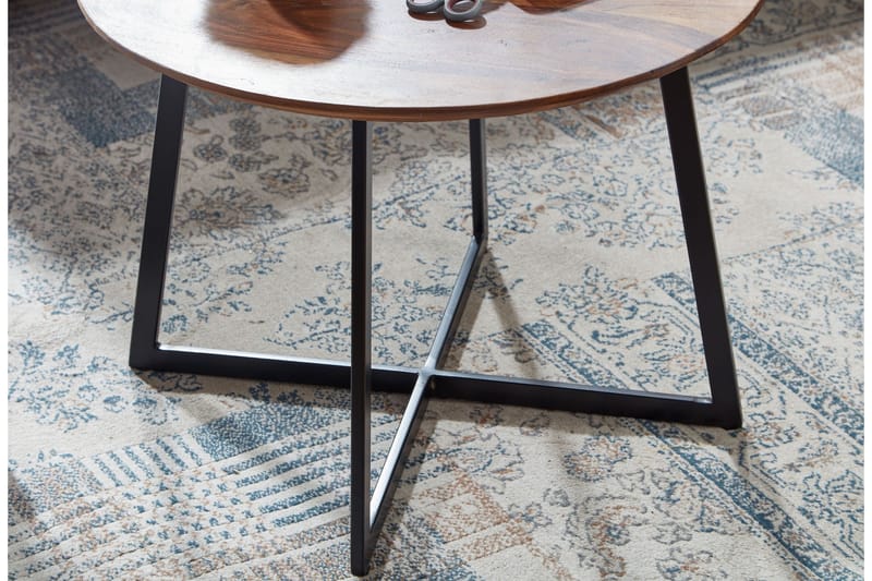 Sohvapöytä Rachid 60 cm Pyöreä on modernilla designilla varustettu pyöreä sohvapöytä, joka sopii täydellisesti sisustukseesi. Pöydän materiaalimixiä hallitsee massiivipuun ja metallin yhdistelmä, luoden tyylikkään ja ilmaisuvoimaisen ilmeen. Pöydän kansi on tummanruskea ja jalat ovat mustat, mikä luo kontrastia ja lisää pöydän visuaalista kiinnostavuutta.