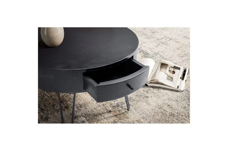 Design Silmiinpistävä sohvapöytä modernissa designissa Pyöreä pöytälevy erilaisten tarvikkeiden säilyttämiseen Vetolaatikko tarjoaa lisää säilytystilaa Pöytälevy on tuettu neljällä tyylikkäällä hiusneulajalalla Mitat Leveys: 60 cm Syvyys: 60 cm Korkeus: 43 cm Vetolaatikon sisämitat (LxKxS): 25,5 x 8 x 25 cm Runko korkeus: 11 cm Materiaalin paksuus: noin 1,5 cm Tarkemmat mitat löytyvät mittapiirustuksesta Väri Koko pöytä: musta mattapinta Erityispiirteet Pienet halkeamat, oksanreiät ja värimuutokset ovat tyypillisiä täyspuulle, koska se on luonnontuote Jokainen pöytä on käsin tehty - tämä voi aiheuttaa epätasaisuuksia, mikä tekee jokaisesta sohvapöydästä ainutlaatuisen Jauhemaalauksen ansiosta jalat ovat iskunkestäviä ja naarmuuntumattomia Pienet esineet löytävät paikkansa vetolaatikosta Suositeltu maksimikuormitus: 40 kg Materiaali Pöytälevy: mustaksi lakattu mangotäyspuu, lisäksi käsitelty kirkkaalla lakalla Jalat: mustaa jauhemaalattua rautaa Toimitussisältö Sohvapöytä ilman koristeita Kokoamisohjeet ja materiaalit sisältyvät toimitukseen Kokoaminen Toimitustila: osittain koottu, vain jalat on kiinnitettävä Hoito-ohjeet Puhdista pinta haalealla vedellä kostutetulla puuvillakankaalla. Älä käytä hankaavia puhdistusaineita, voimakkaita puhditusaineita tai läpimärkiä rättiä.