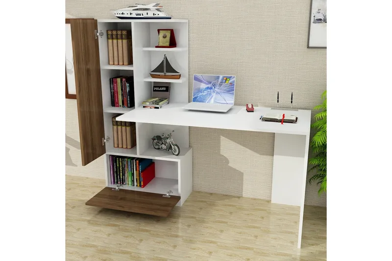 Pöydän leveys on 120 cm, mikä tarjoaa riittävästi tilaa työskentelyyn. Säilytystilaa löytyy hyllyjen, laatikon ja kaapin ansiosta, joten voit pitää työpöydän siistinä ja järjestettynä. Pöydän jalat on valmistettu kestävästä melamiinista, spånskivasta ja puusta, mikä takaa sen vakauden ja kestävyyden.