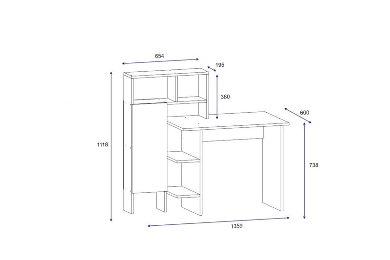 Pöytä tarjoaa runsaasti säilytystilaa hyllyjen ja kaapin avulla, jotta voit pitää työpöydän siistinä ja järjestettynä. Hyllyt tarjoavat kätevän paikan kirjoitusvälineille, kirjoille ja muille tarvikkeille, kun taas kaappi piilottaa pois suuremmat tai arvokkaammat tavarat.