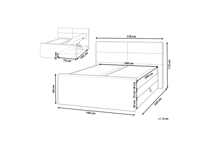 Ominaisuudet: Kiinteä ja joustava patja (H2 keskitaso), Jakaa vartalon painon tasaisesti, Mukava ja leveä nukkumisalue, Takaa mukavan selkätuen, Käytännöllinen säilytystila, Pneumaattinen nosto, joka varmistaa helpon pääsyn säilytystilaan
