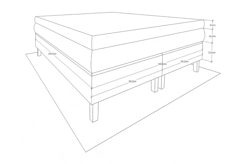 - Materiaali joustinpatja: Pussijousi (270 jousta/m², jousen paksuus 1,8 mm). Jaettu