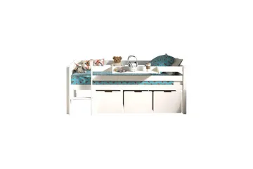 Keskikorkea sänky tikkailla ja laatikoilla Pino Valkoinen, 2 kappaleen sarja, Riippuvalla hyllyllä