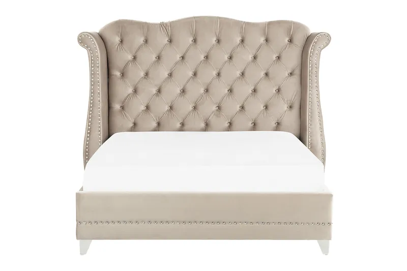 Ylellinen samettiverhoiltu parivuode. Tämä erittäin tyylikäs parisänky tuo ylellistä tunnelmaa mihin tahansa makuuhuoneeseen. Kurvikas, napeilla koristeltu sängynpääty on täydellinen korostuskappale sekä perinteisiin että glamour-tyylisiin sisustuksiin. Sängynrungon ja -päädyn reunat on viimeistelty tyylikkäillä verhoilunauloilla. Mukana tuleva vankka sälekehys tarjoaa oikeanlaisen tuen, jakaen vartalon painon tasaisesti. Kauniin värisen samettiverhoilunsa ansiosta vuode on helppo yhdistää tilaan kuin tilaan värimaailmasta riippumatta.