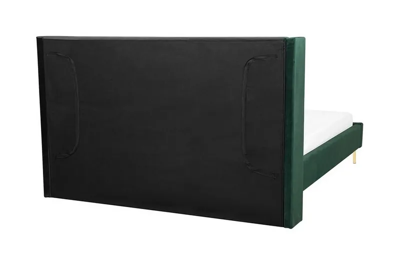 Glamour-tyylinen verhoiltu parivuode. Tuo ylellistä tunnelmaa makuuhuoneeseesi tällä tyylikkäällä parisängyllä. Suorakaiteen muotoinen sänky on varustettu korkealla sängynpäädyllä, jonka pystysuorat juovat antavat sängylle modernin ilmeen. Jalkopäätä tukevat sirot metallijalat, jotka korostavat sängyn muotoilua, taaten vahvan ja kestävän rakenteen. Koko sänky on verhoiltu tummanvihreällä sametilla hienostuneen ilmeen takaamiseksi. Modernin sävynsä ja muotoilunsa ansiosta sänky sopii moniin erilaisiin sisustuksiin.