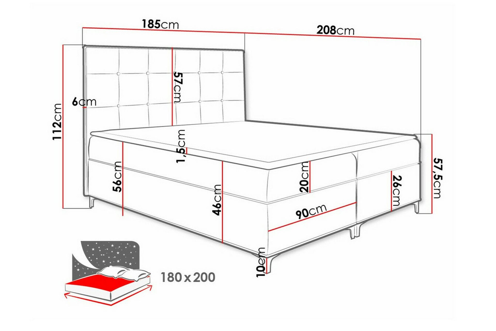 - Vuodekoko: 180x200