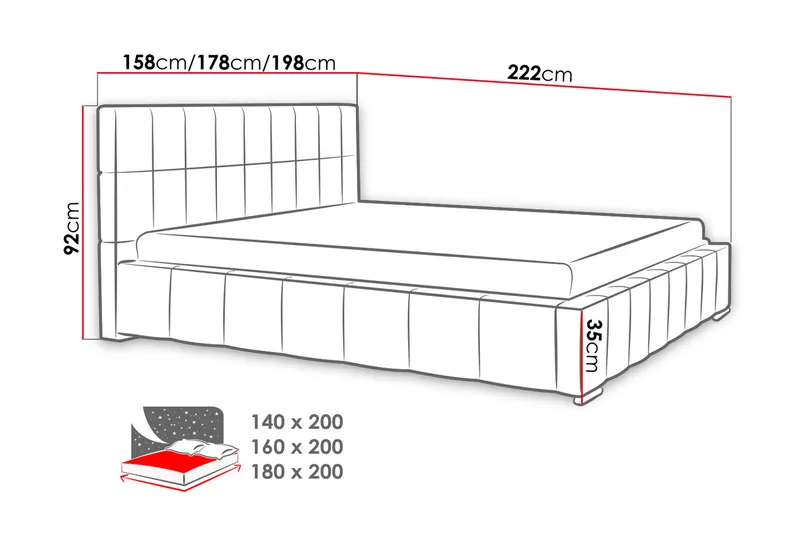 | Vuodekoko | 180x200 |