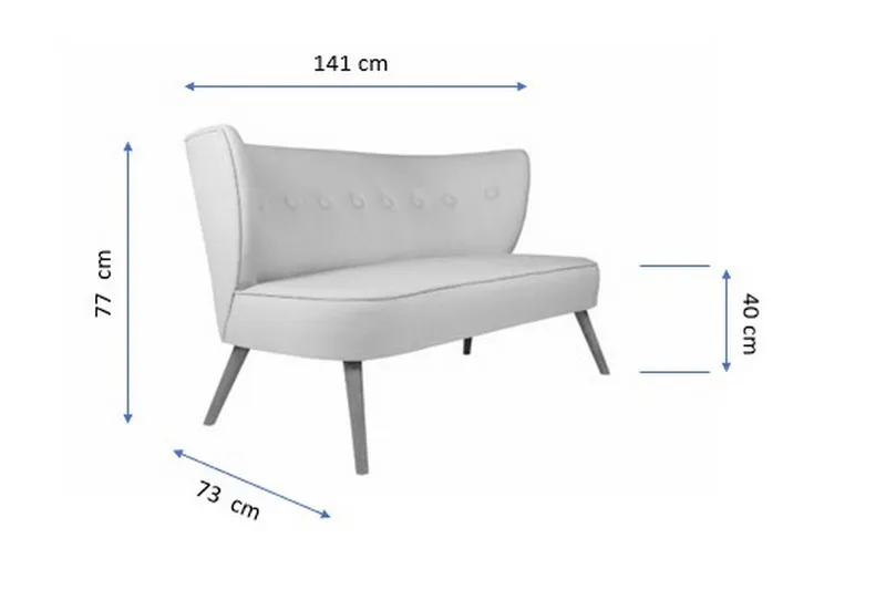 Sohvan mitat ovat 141 cm leveä, 77 cm korkea ja 73 cm syvä. Istuinleveys on myös 141 cm, joten siinä on mukava istua kahdelle henkilölle. Selkätyynyn leveys on sama kuin istuinleveys, joten se tarjoaa mukavaa tukea selälle. Sohvassa on myös divaani, jonka istuinsyvyys on 73 cm.