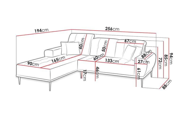 Sohvan mitat ovat leveys 256 cm, korkeus 94 cm ja syvyys 194 cm. Istuinsyvyys on 60 cm ja divaanin istuinsyvyys on 165 cm. Divaanin leveys on 90 cm ja kokonaissyvyys 194 cm. Sohva vaatii kokoamisen, mutta sen mukana tulee selkeät ohjeet.