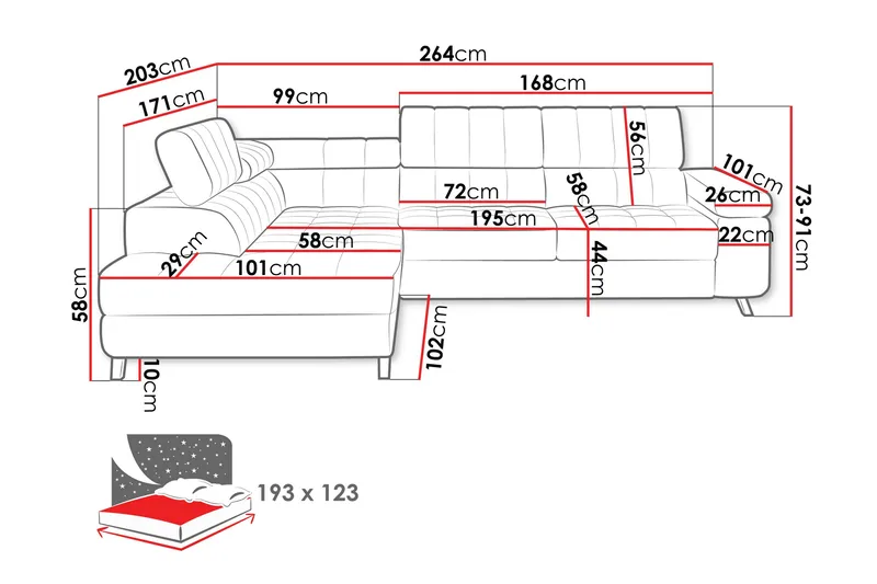 - Kokonaissyvyys avopääty: 203 cm