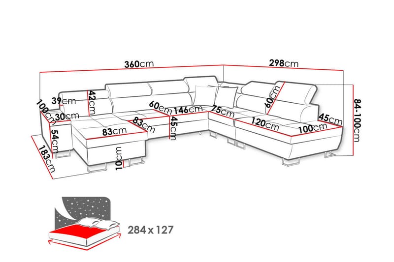 Torretta-vuodesohvalla on U-muotoinen muotoilu, joka tuo tyylikkyyttä ja eleganssia sisustukseen. Sen leveys on 298 cm, korkeus 100 cm ja syvyys 360 cm, mikä tekee siitä tilavan ja mukavan istumapaikan.