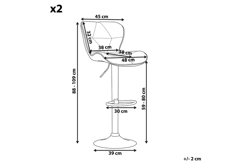 Trendikäs säädettävä baarijakkarasetti. Tee ruokailutilasta tai keittiöstä entistä tyylikkäämpi ja hienostuneempi tällä kahden baarijakkaran setillä. Niiden universaali väri sekä moderni muotoilu sulautuu täydellisesti useisiin sisustuksiin ja värimaailmoihin. Tuolien keinonahkaverhoilluissa istuimissa on paksu pehmuste sekä profiloidut istuimet ja selkänojat, joiden ansiosta niillä on mukava istua. Tyylikäs timanttiommel tuo eleganssin tuntua. Baarituolit kääntyvät 360 astetta ja niiden istuinten korkeutta voidaan säätää. Lisäksi metallijalustat on varustettu jalkatuella, jolla lepuuttaa jalkoja.