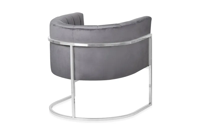 Kaunis samettinen nojatuoli. Tämä puhdaslinjainen ja yksinkertaisen muotoilun omaava nojatuoli sulautuu erinomaisesti moderneihin tai vintage-tyylisiin sisustuksiin. Pehmeällä ja helppohoitoisella harmaalla samettikankaalla verhoillussa tuolissa on matala, kaareva selkänoja, jonka pystytikkaus muistuttaa simpukkaa. Tukevien, ruostumattomasta teräksestä valmistettujen hopeanväristen jalkojen ansiosta se on sekä vakaa että tyylikäs, tuoden tilaan vanhan Hollywoodin glamour-tyyliä.