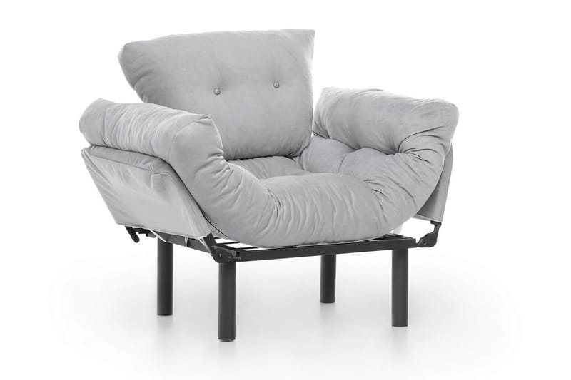 Nojatuolin jalat ovat mustat, mikä luo kontrastin harmaalle värille. Tämä yhdistelmä tekee nojatuolista modernin ja tyylikkään. Divaanin leveys on 60 cm, joten voit venyttäytyä mukavasti ja rentoutua täysin.