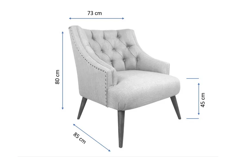 Nojatuolin mitat ovat seuraavat: leveys 73 cm, korkeus 80 cm ja syvyys 85 cm. Istuimen mitat ovat leveys 42 cm, syvyys 57 cm ja korkeus 45 cm. Selkänojan korkeus on 80 cm ja selkätyynyn leveys 73 cm. Käsinojan syvyys on 34 cm ja leveys 10 cm.