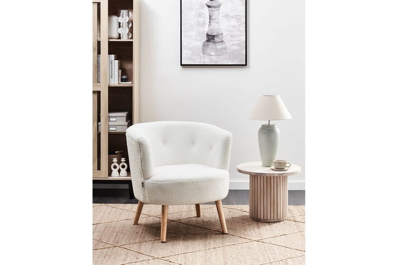 Tämä moderni nojatuoli on suunniteltu puolikaaren muotoiseksi täydellistä mukavuutta varten. Paksusti pehmustetun leveän istuimen ja matalan selkänojan ansiosta se on mukava kaluste, johon voi käpertyä. Nojatuoli on verhoiltu kestävästä bouclé-kankaasta valkoisena, ja se on erinomainen lisä moderniin, vintage- tai skandinaaviseen olohuoneeseen.