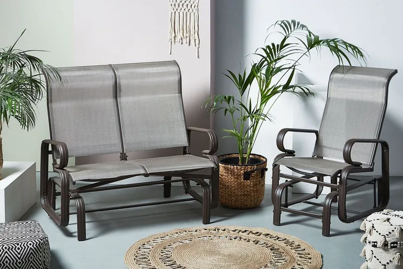 Moderni puutarhatuoli. Tämä nykyaikainen puutarhatuoli tarjoaa täydellisen rentoutumispaikan mihin tahansa ulkotilaan, tuoden siihen modernia tyyliä. Penkin runko on valmistettu kestävästä jauhemaalatusta alumiinista ja istuinosa mukavasta tekstiilistä. Materiaaliensa ansiosta kaluste sopii loistavasti ulkokäyttöön. Säädä penkki mieltymyksesi mukaan, nojaa vakaata ja mukavaa selkänojaa vasten ja nauti aurinkoisista kesäpäivistä.