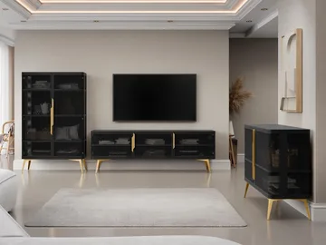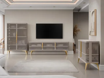 Mireva olohuoneen kalustesetti – TV-taso, vitriinikaappi ja senkki