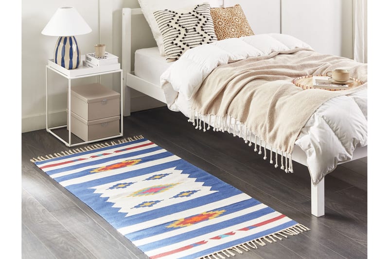 Kaksipuolinen puuvillamatto geometrisella kuviolla. Lisää täydellinen aksentti kotiisi tällä ainutlaatuisella käsin tehdyllä puuvillaisella Kelim-matolla. Sen upea sinivalkoinen geometrinen kuvio on koristeltu punaisin yksityiskohdin, jotka varmistavat uniikin ilmeen. Maton päädyissä olevat hapsut ja kääntöpuoli tekevät matosta monipuolisen lisän mihin tahansa tilaan. Anna tilallesi uutta ilmettä tällä erottuvalla Kelim-matolla.