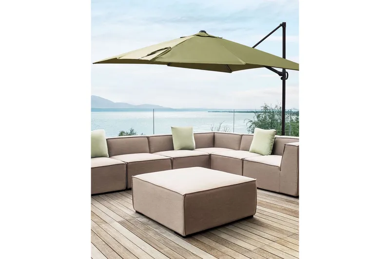 Moderni säädettävä aurinkovarjo. Minimalistisen muotoilunsa ansiosta tämä suuri riippuva aurinkovarjo on täydellinen kaluste mihin tahansa puutarhaan. Varjo on valmistettu UV-kestävästä polyesterikankaasta ja jalka on tukevaa alumiinia. Kätevän kampikäyttöisen avausmekanismin ansiosta varjon avaaminen ja sulkeminen on erittäin vaivatonta. 360 astetta kääntyvää varjoa on helppo kääntää auringon suunnan mukaan, joten se tarjoaa aina suojan paahteelta.