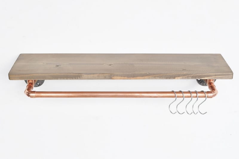 Seinähylly Ranae 60 cm on valmistettu laadukkaasta puusta, joka takaa kestävyyden ja pitkän käyttöiän. Hyllyssä on kaunis pähkinän värinen ulkonäkö, joka sopii täydellisesti erilaisiin sisustustyyleihin. Lisäksi hyllyn metalliset yksityiskohdat kuparin värissä tuovat siihen ripauksen eleganssia.
