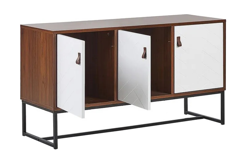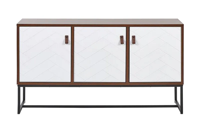Moderni suorakulmainen kaappi. Tämä sivupöytä on loistava vaihtoehto, jos etsit perinteistä säilytysratkaisua modernilla ilmeellä. Tuote on valmistettu kestävästä MDF-levystä ja tukevista metallisista jaloista. Pöydän kolme erillistä osaa tarjoavat runsaasti säilytystilaa. Tyylikkäät yksityiskohdat, kuten keinonahkaiset vetimet, tekevät pöydästä hienostuneen.