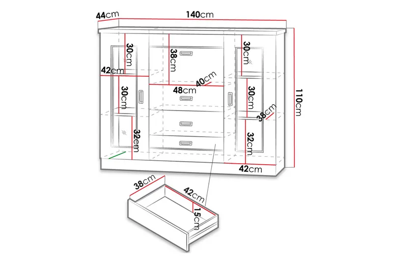 Kaapin mitat ovat 140x44x110 cm, mikä tekee siitä tarpeeksi tilavan säilyttämään erilaisia esineitä ja tarvikkeita. Kaapin sisällä on kätevät laatikot ja hyllyt, jotka auttavat pitämään tavarat järjestyksessä.