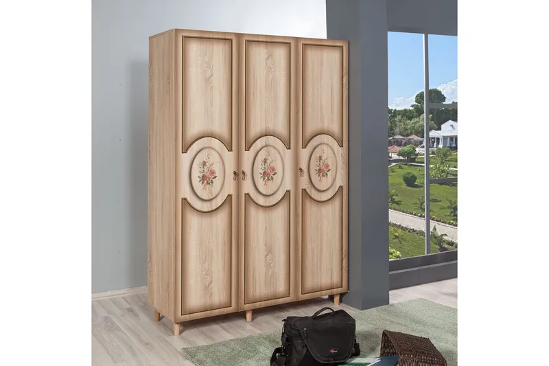 Vaatekaapin materiaalityyppi on kestävä melamiini, joka takaa pitkän käyttöiän. Sen ruskea väri ja tammen sävyinen pinta tuovat lämpöä ja tyylikkyyttä mihin tahansa sisustukseen. Jalkojen ruskea väri sopii saumattomasti vaatekaapin yleisilmeeseen.