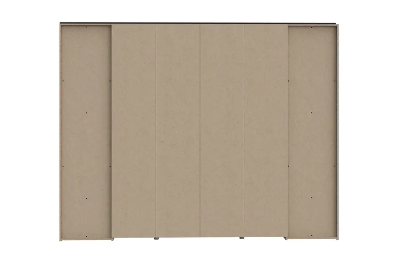 Vaatekaapin keskiosassa on liukuovet, jotka piilottavat sisäänsä kaksi tilavaa vaatetankoa sekä niiden yläpuolella olevan hyllyn. Näiden avulla voit helposti järjestää vaatteet siististi ja pitää ne hyvässä järjestyksessä. Lisäksi kaapin oikealla ja vasemmalla puolella on hinged ovet, joiden takana on viisi hyllyä kummallakin puolella.