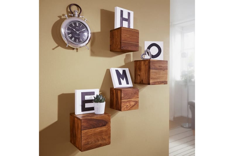 Mille sopii? 4-osainen seinähyllysarja on ihanteellinen hyllyksi television yläpuolelle tai eteiseen - seinäkiinnikkeiden asennusmateriaali sisältyyHoito-ohjeet: puhdista pinta lämpimällä puuvillaliinallaÄlä käytä hankaavia tai voimakkaita puhdistusaineita tai tipuvan märkiä liinojaLuonnolliselle pinnalle ei tarvita lisäkäsittelyä (öljyäminen, vahaaminen)MuotoiluModerni täyspuinen seinähyllysarjaKaksi eri kokoa4-osainen seinähyllysarja ainutlaatuisella syykuviollaMitatIso kuutioLeveys: 25cm Korkeus: 25cm Syvyys: 25cmPienten kuutioiden mitatLeveys: 20cm Korkeus: 20cm Syvyys: 20cmPuupaksuus: 1,5 cmErikoisuudetValmistettu käsinJokainen hylly on ainutlaatuinenSisempi osasto ei ole tarkoitettu säilytykseenAvoin puoli kohtaa seinääLaite seinäasennusta varten hyllyjen avoimella puolellaMateriaaliSheesham-täyspuuKoska se on käsintehty ja luonnontuote, voi esiintyä värieroja tai epätasaisuuksiaToimitussisältö4 seinähyllyäToimitus ilman koristeluaKokoaminenToimitustila: koottu
