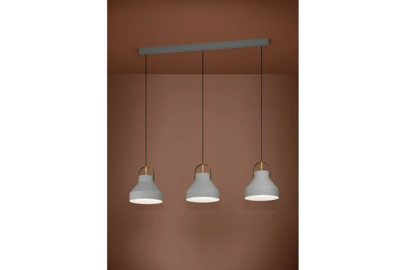 Roikkuva valaisin Estepona yhdistää teollisen viehätyksen moderniin eleganssiin. Kolmella kartiomaisella vaaleanharmaalla teräsvarjostimella, joista jokainen on ripustettu mustalla tekstiilijohdolla ja koristeltu harjatulla messinkikahvalla, tämä kappale tarjoaa sekä tyyliä että luonnetta.