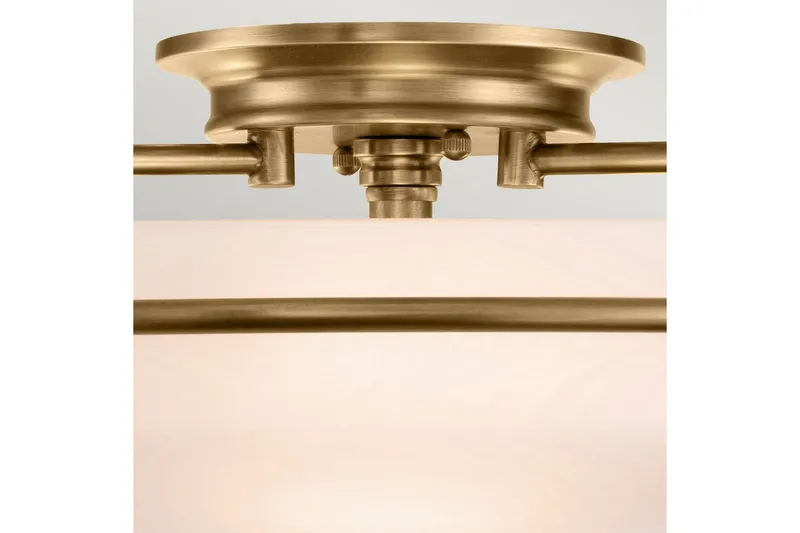 Tässä hienovaraisessa tyylissä on tyylikäs ja pehmeän moderni ilme, joka sopii lähes mihin tahansa huoneeseen. Hiekkapuhallettu varjostin on maalattu sisältä valkoiseksi, mikä hajauttaa valon tasaisesti ja valaisee kotisi rauhoittavalla hehkulla. Se on kiinnitetty paikoilleen pehmeästi kaarevilla varsilla, jotka on viimeistelty patinoidulla messingillä.