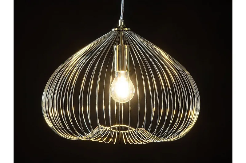 Industriaalinen avonainen valaisin. Tämä kultaisesta metallilangasta valmistettu kattovalaisin viimeistelee jokaisen sisustuksen. tarjoaa tarkan keskipisteen kaikkiin nykyaikaisiin asetuksiin. Valaisimen teollinen muotoilu sopii mainiosti sekä loft-asuntoihin että katseenvangitsijana perinteisempiin asuntoihin. Varjostimen avoin rakenne toimii erityisen hyvin näyttävän lampun kanssa.